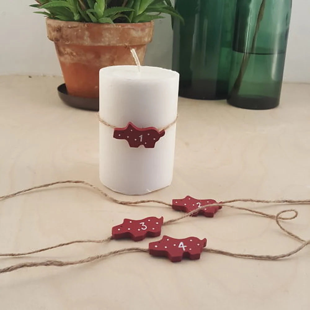 Jedes Schweinchen ist liebevoll gestaltet in dunkelrotem Weinrot mit weißen Ziffern und kleinen Punkten, die wie Schneeflocken wirken. Die Juteschnur sorgt für einen natürlichen Akzent und unterstreicht den rustikalen, nordischen Stil.