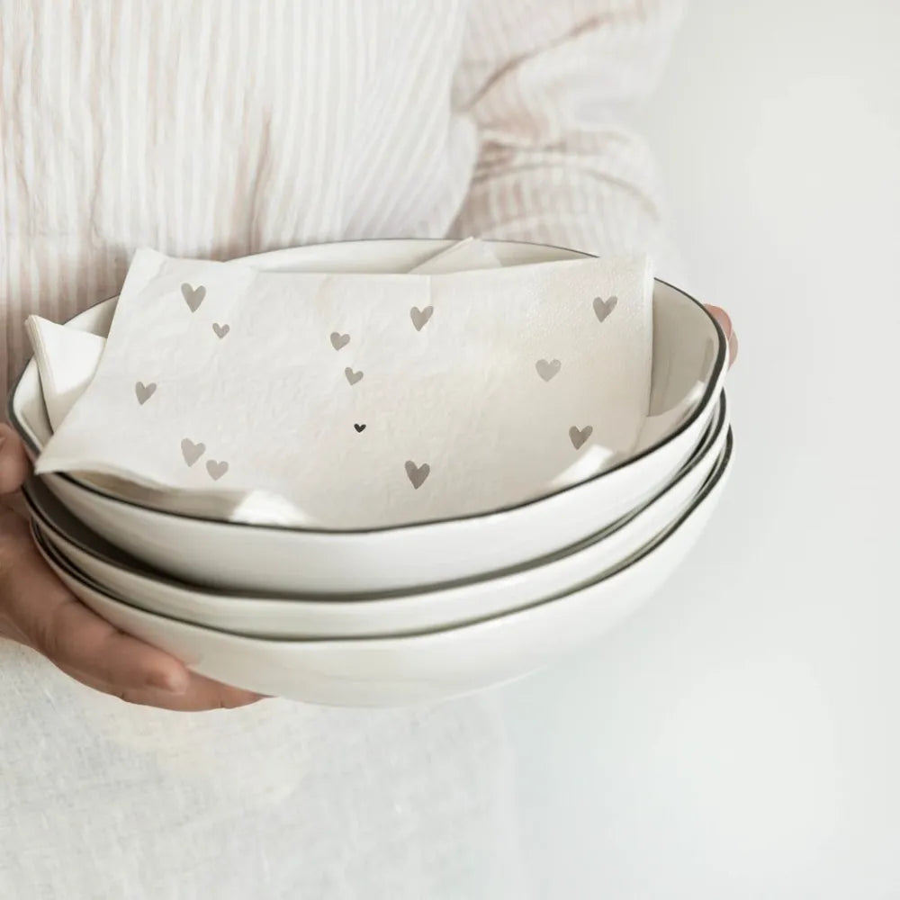 Verleihe deinem Esstisch im Handumdrehen eine extra Portion Herzlichkeit! Diese bezaubernden Papierservietten von Bastion Collections bringen mit ihren zarten Herzen in Naturtönen auf reinweißem Grund eine wunderbar romantisch-verspielte Note in dein Zuhause. Ob für den gemütlichen Kaffee am Nachmittag oder ein liebevoll gedecktes Dinner – sie sind das kleine Highlight, das Freude schenkt.