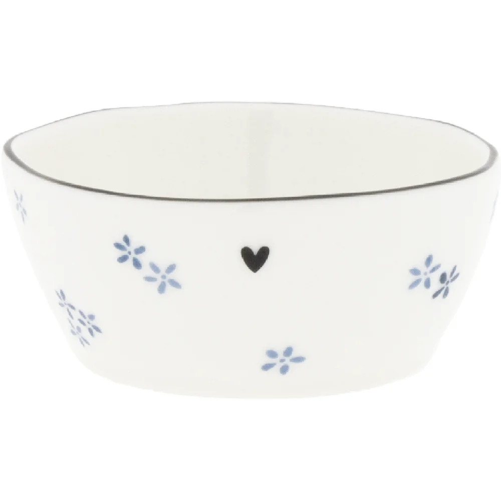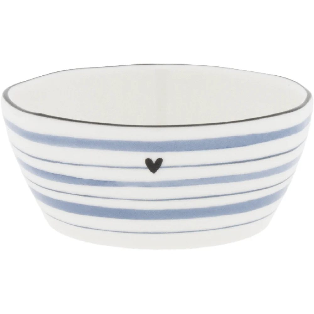 Jede Schale ist ein Unikat mit handbemaltem Muster in verschiedenen Blautönen – von zarten Zweigen über kleine Sterne bis hin zu maritimen Streifen. Der feine schwarze Rand verleiht ihr einen eleganten Abschluss und das kleine Herz in der Mitte ist das typische Bastion Collections Detail, das alle Herzen höher schlagen lässt.