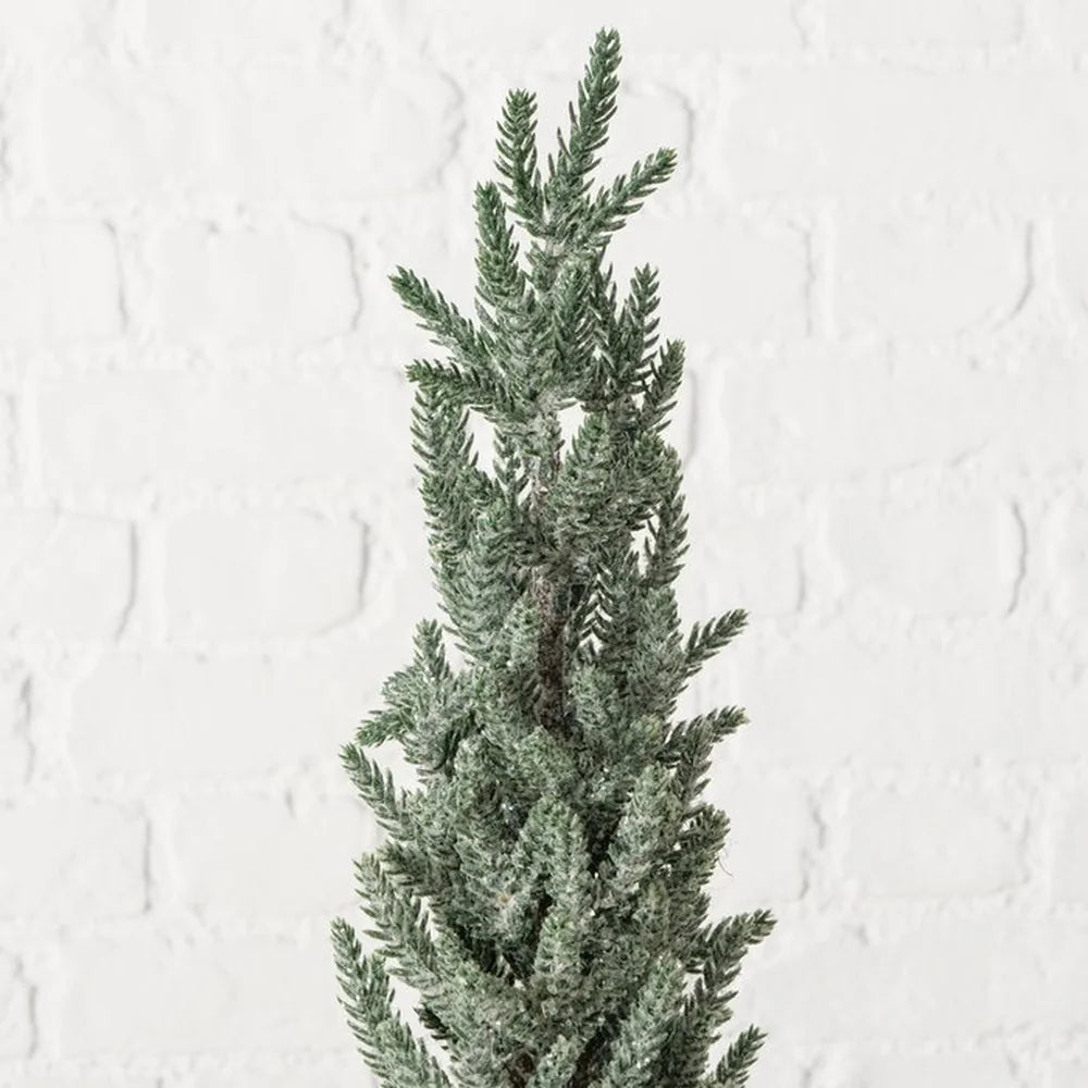 Liebe auf den ersten Blick: Der schlanke Dekobaum bringt nordische Leichtigkeit in dein Zuhause. Sein schmaler Wuchs erinnert an einen jungen Zypressenbaum, die zart grün beflockten Nadeln wirken wie von Frost geküsst und lassen sofort Weihnachtsgefühle aufkommen. Handgearbeitet und mit einem naturbelassenen Jute-Fuß, verströmt dieses Prachtexemplar den Charme eines Waldbesuchs ohne Nadeln auf dem Boden. Er ist ein echter Blickfang für Wohnzimmer, Flur oder die gedeckte Tafel – und das ganz ohne Pflege.