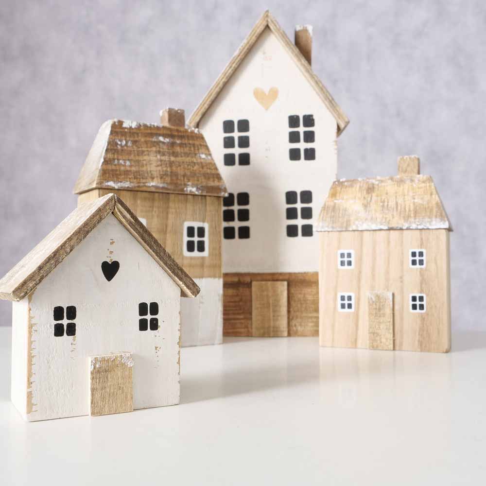 Dieses 4er-Set von Dekoaufstellern in Form von kleinen Holzhäusern bringt eine gemütliche Atmosphäre in dein Zuhause. Perfekt für alle, die einen Hauch von skandinavischem Charme oder ländlicher Gemütlichkeit suchen!