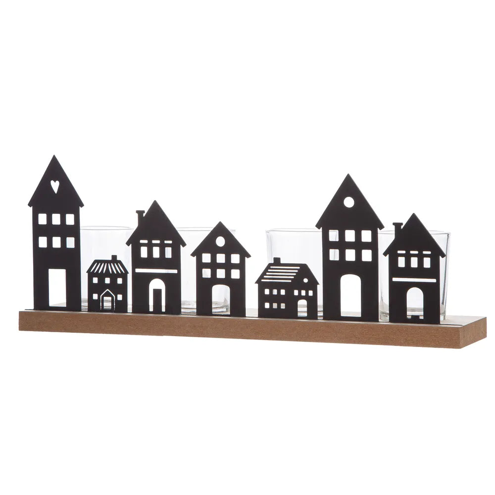 • Sieben unterschiedlich hohe Haus-Silhouetten aus mattschwarzem Metall
