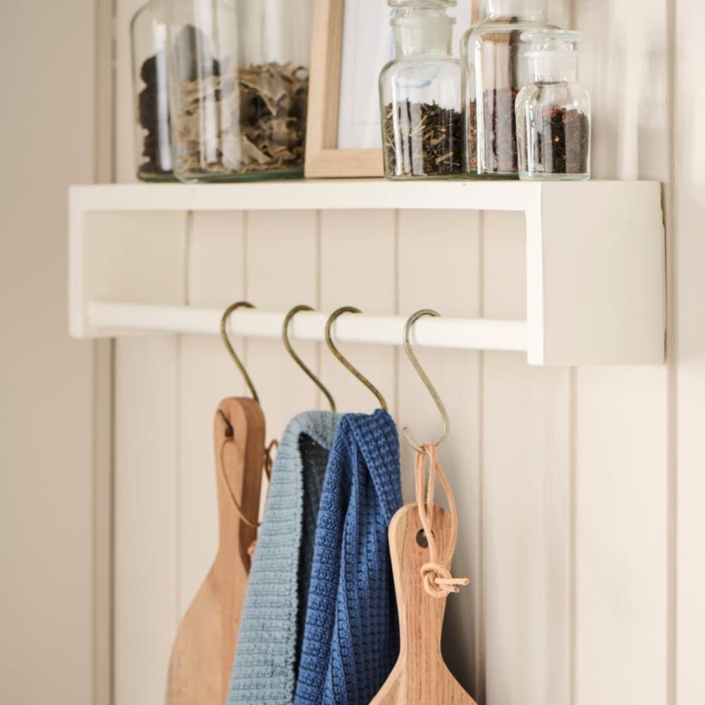 Hänge dieses clevere Regal im Bad auf, die Stange nach unten. So hast du oben Platz für deine Apotekergläser und unten eine flotte Reling für dein bestricktes Handtuch oder kleine S-Haken. Ordnung im Hygge-Style – was für ein Glücksgriff! ♥