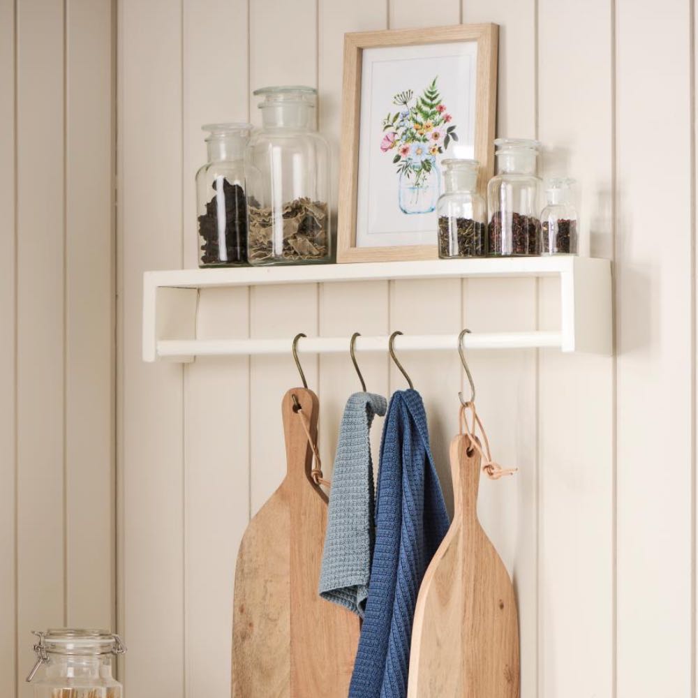 Dieses Schmuckstück bringt sofort skandinavische Leichtigkeit in dein Zuhause. Gefertigt aus hellem, seidenmatt lackiertem Holz in einem warmen Cremeweiß, ist dieses Regal eine echte Augenweide. Das Beste daran? Du kannst es wenden und so spielend leicht entscheiden, ob du eine hohe Kante oder eine praktische Stange für deine Textilien möchtest. Ein echter Seelenwärmer für deine Wände!