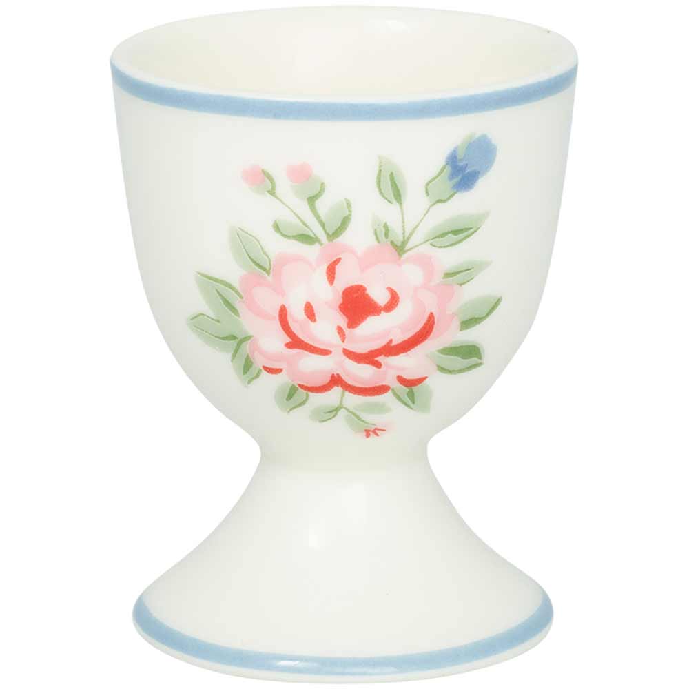 Der Henriette Eierbecher macht dein Frühstücksei zum Highlight. Das weiße Porzellan ist mit einem filigranen Blumendekor in Rosa und Grün verziert, das von einem zarten blauen Rand eingerahmt wird. Durch den schlanken Fuß steht das Ei sicher, während das romantische Design für gute Laune am Morgen sorgt.