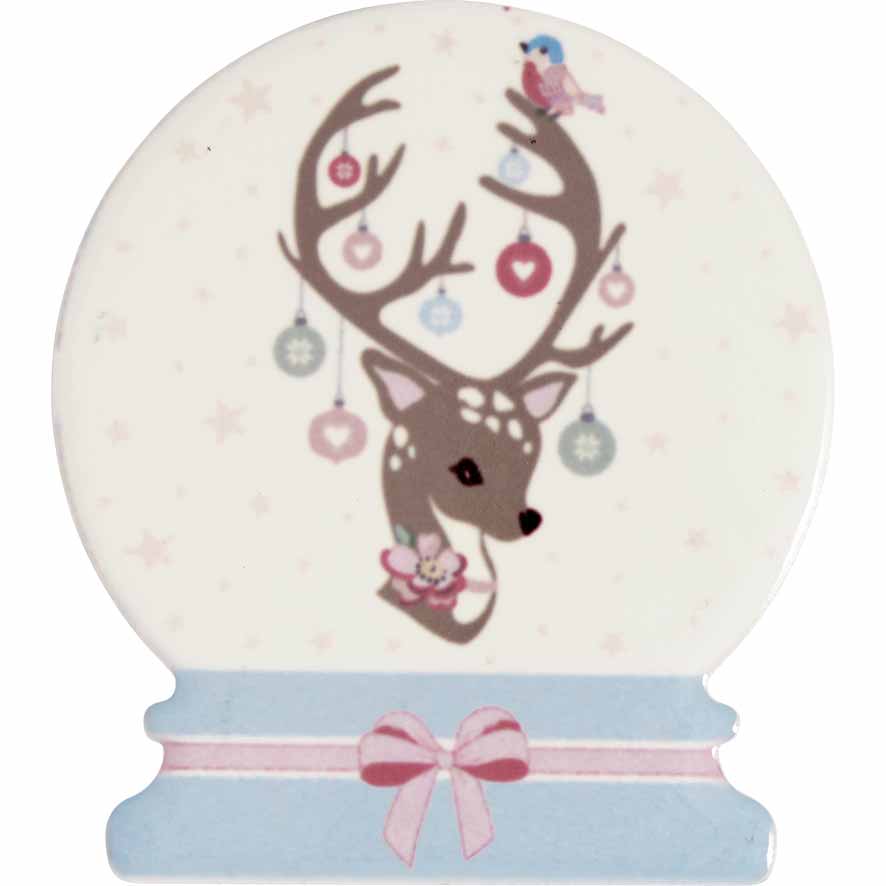 | Design | Schneekugel mit Rentier, Vogel und Ornamenten; pastellfarbener Sockel mit Schleife |