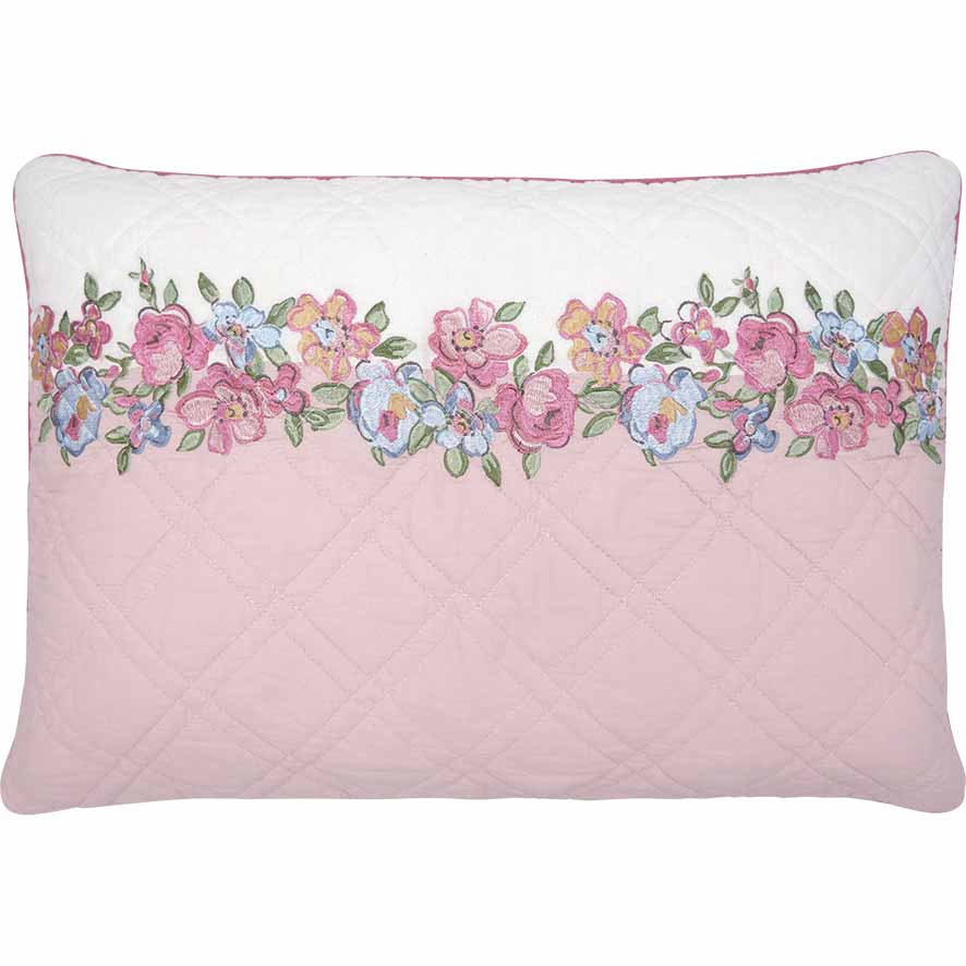 Dieser rechteckige Kissenbezug bringt eine sanfte Eleganz in dein Zuhause. Die Kombination aus quiltigem Pastellrosa und einer weißen Partie, geschmückt mit einer Stickerei aus bunten Blüten, sorgt für ein harmonisches Gesamtbild. Er lädt förmlich zum Anlehnen ein und macht jeden Sitzplatz kuschelweich.