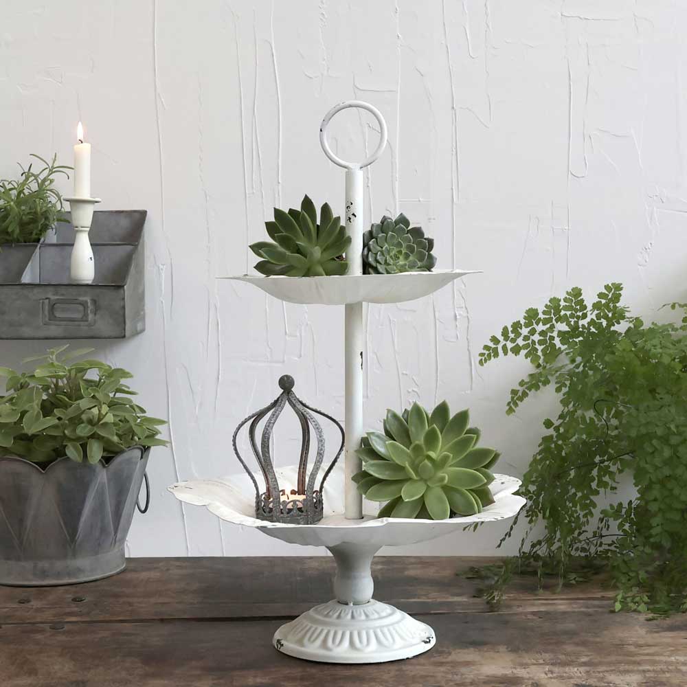 Die zweistöckige Etagere mit Blumen ist ein wahrer Blickfang für deinen Tisch. Ihre beiden Teller sind wie sanfte Blütenblätter geformt und verströmen romantischen Vintage-Charme. Ein großer Ring am oberen Ende erleichtert das Tragen und unterstreicht die elegante Silhouette. Ob du Gebäck, Obst oder kleine Pflanzen darauf arrangierst – sie verwandelt jedes Arrangement in ein kleines Kunstwerk.