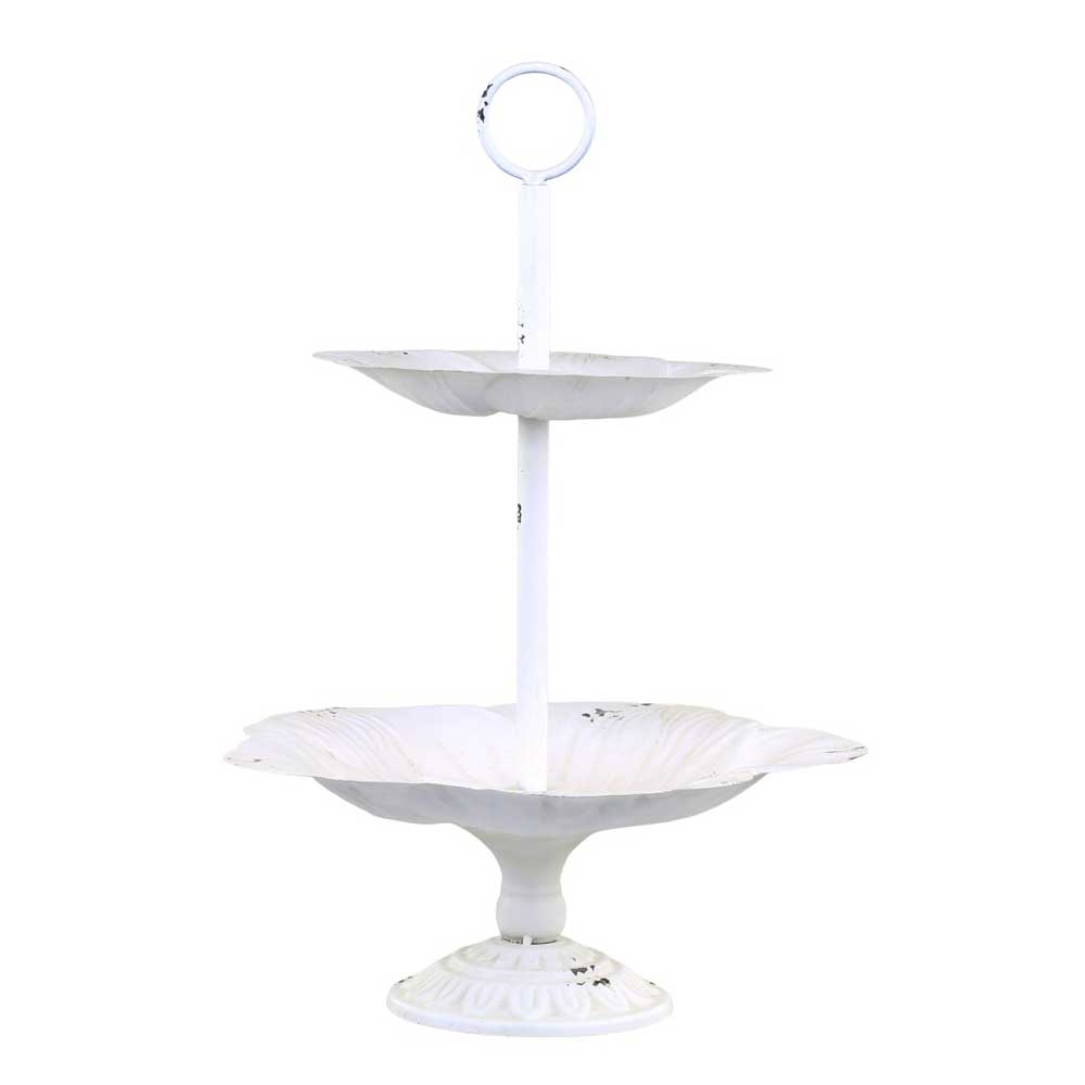 Die Etagere ist 51 cm hoch und hat einen Durchmesser von 34 cm. Aus Metall gefertigt und in antikem Creme lackiert, erhält sie durch kleine Abnutzungsstellen den typischen Shabby-Look. Die zwei Ebenen bieten ausreichend Platz für Kuchen, Cupcakes oder herzhafte Häppchen. Dank des praktischen Tragegriffs kannst du das Gestell sicher transportieren. Nach dem Einsatz lässt es sich einfach reinigen und platzsparend verstauen.