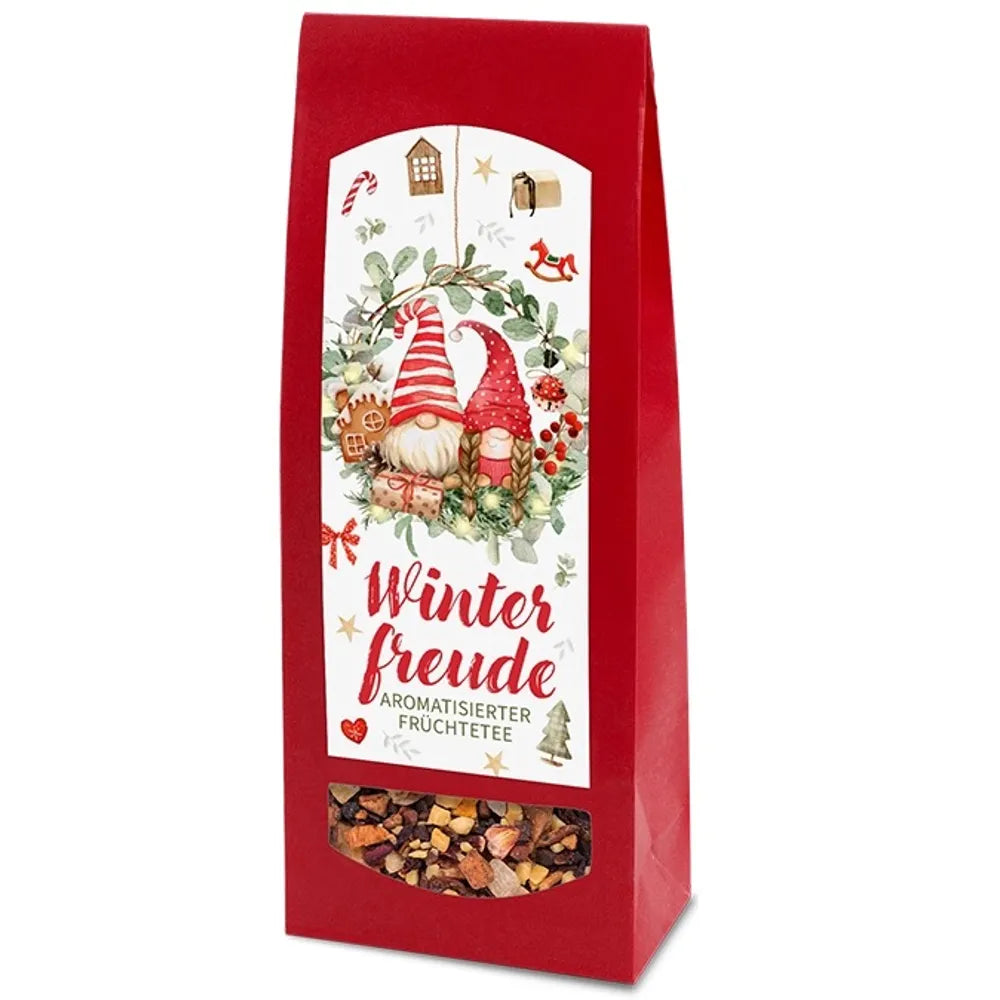 Präsentiere den Tee in einer durchsichtigen Dose, um die festlichen Farben der Zutaten zur Geltung zu bringen. Ein echter Hingucker auf dem Teetisch und das perfekte Geschenk in der Adventszeit!