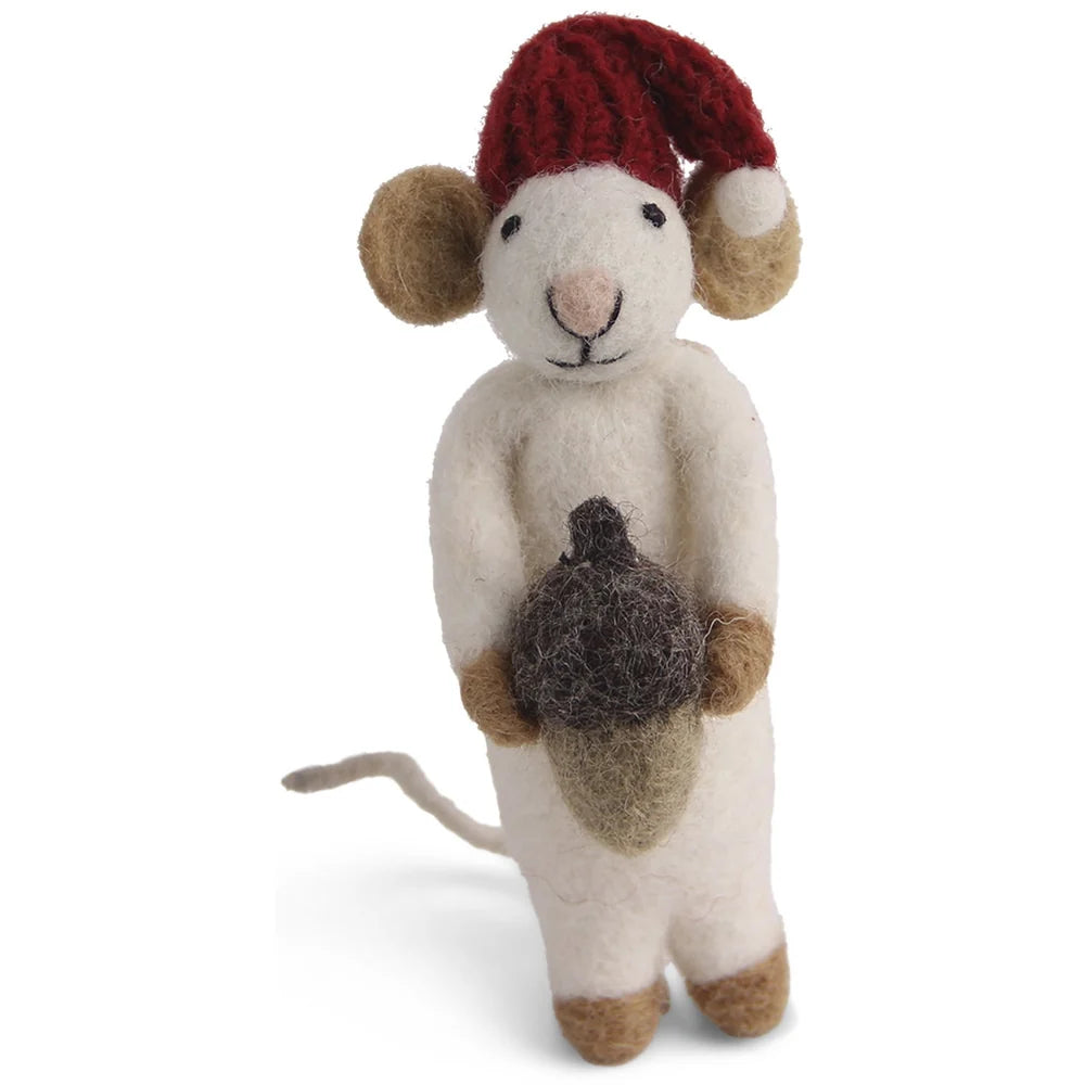 Ein Filz-Mäusemädchen von Gry & Sif ist mit einer roten Mütze und einem braunen Pullover geschmückt und hält ein rotes Geschenk.