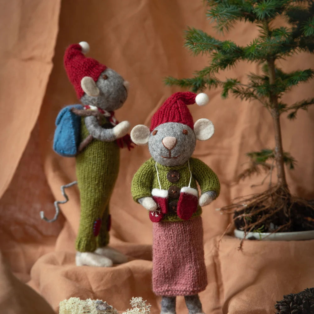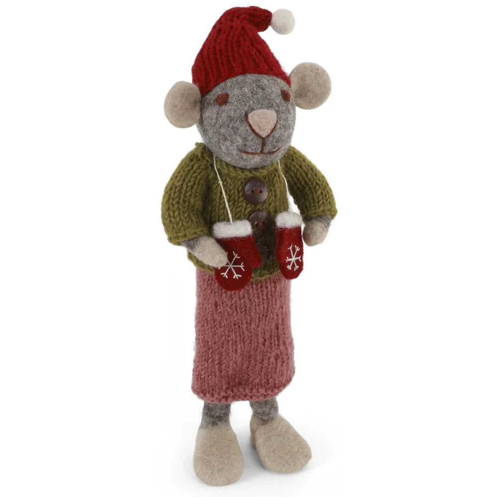 Dieses Mittelgroße graue Maus mit Fäustlingen bezaubert mit graue maus mit roter mütze, grünem pullover, rosa rock und roten fäustlingen. Verspielte Dame mit Wintermoden lädt zum Träumen ein und bringt skandinavischen Charme in dein Zuhause.