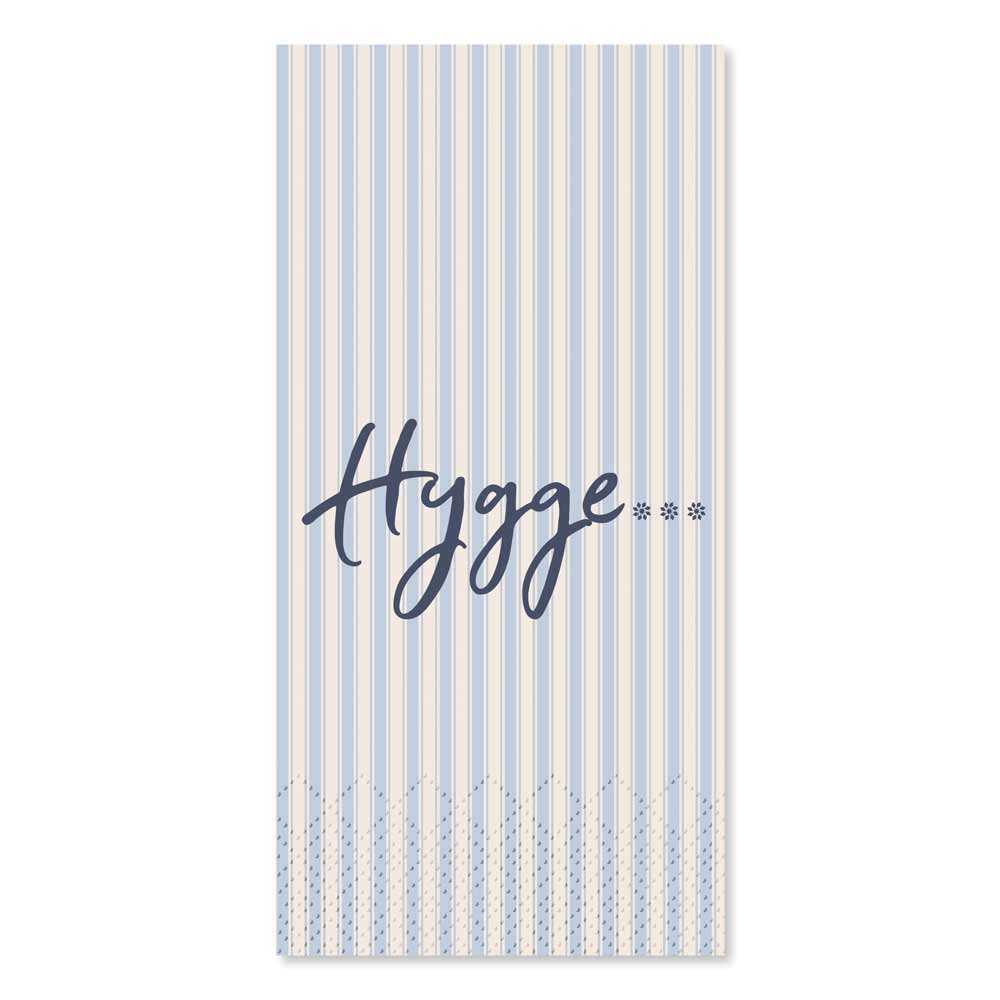Diese hochwertigen, 3-lagigen Servietten überzeugen mit ihrem stilvollen Design: vertikale Streifen, ein eleganter „Hygge“-Schriftzug und dezente Muster wie kleine Schneeflocken. Die geschwungene Schrift in Dunkelblau verleiht der Tischdeko einen charmanten, nordischen Touch.