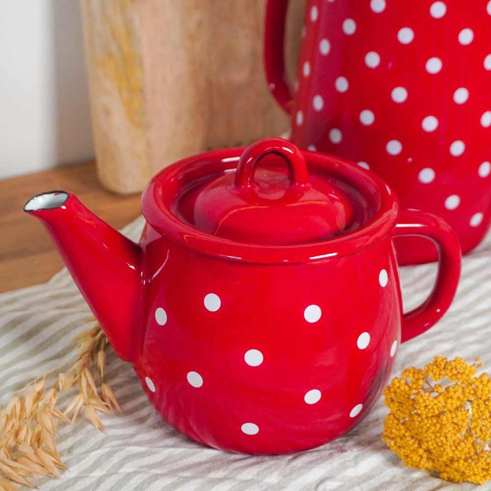 Arrangiere die Teekanne mit passenden Tassen und einem Blumenstrauß im selben Farbspektrum, um einen harmonischen Look zu schaffen. Besonders schön wirkt sie auf einem hellen Tischläufer mit Spitzenborte und zusammen mit ländlichen Leinenservietten.