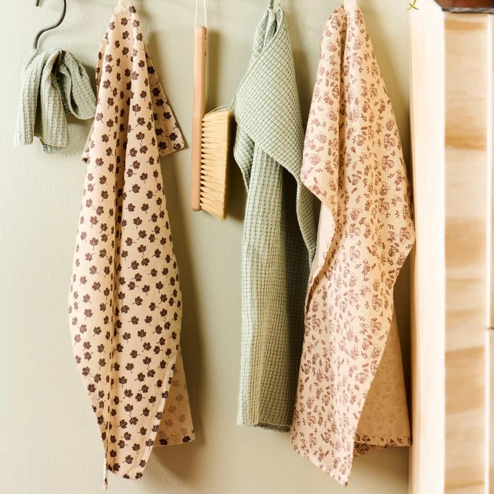 Liebe geht durch den Magen – und durch liebevoll gestaltete Küchentextilien. Dieses Tuch in Naturfarbe ist übersät mit kleinen braunen Pilzmotiven und bringt eine Prise Waldspaziergang in deine vier Wände. Die saugstarke Baumwolle trocknet Geschirr im Handumdrehen.