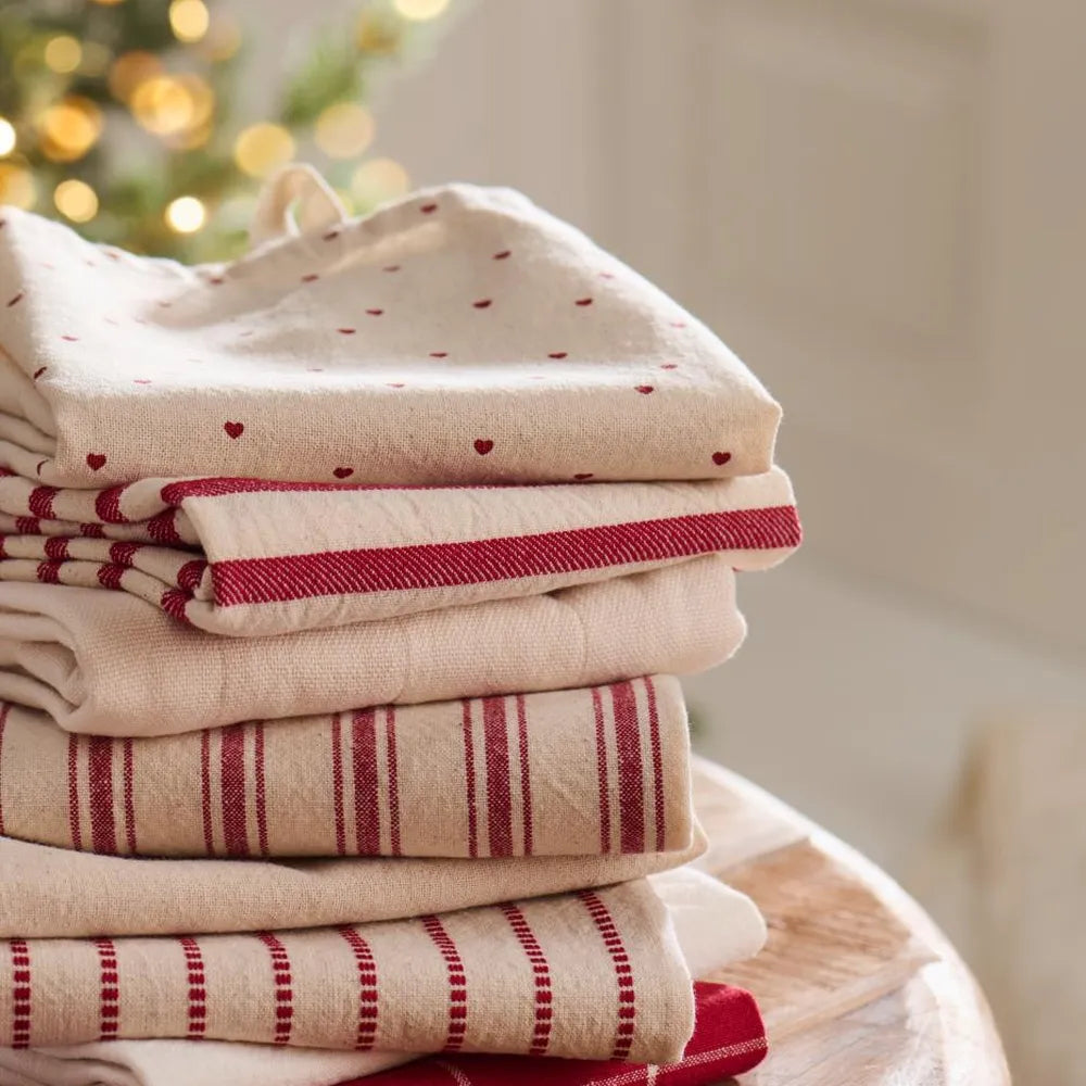Mit dem Geschirrtuch „Valentin“ wird Abtrocknen zum liebsten Küchenritual. Der natürliche Hintergrund mit kleinen roten Herzen verbreitet Liebe und Wärme, während die weiche Baumwolle besonders angenehm in der Hand liegt.
