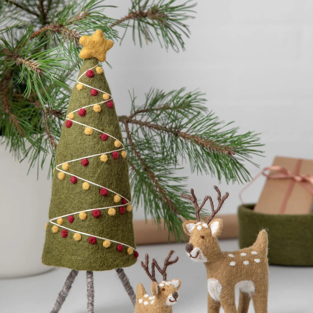Dieser kleine braune Hirsch verbreitet Waldatmosphäre und natürliche Eleganz in jedem Raum. Mit seinen zierlichen Maßen passt er überall hin, und dennoch zieht er mit seinem stolzen Geweih sofort alle Blicke auf sich. Die warmen Brauntöne erinnern an weiches Fell, während die hellen Punkte auf dem Rücken an das bezaubernde Muster junger Rehe denken lassen. Hergestellt aus handgefilzter Wolle strahlt er Behaglichkeit und nordische Ruhe aus.