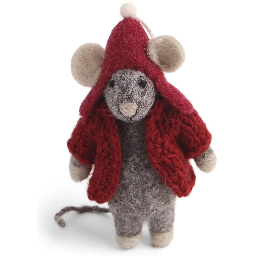 Die Gry & Sif - Maus grau Filz mit Herz ist eine Mausfigur aus grauem Filz mit einem roten Herz und einer Weihnachtsmannmütze, die aufrecht vor einem weißen Hintergrund steht.