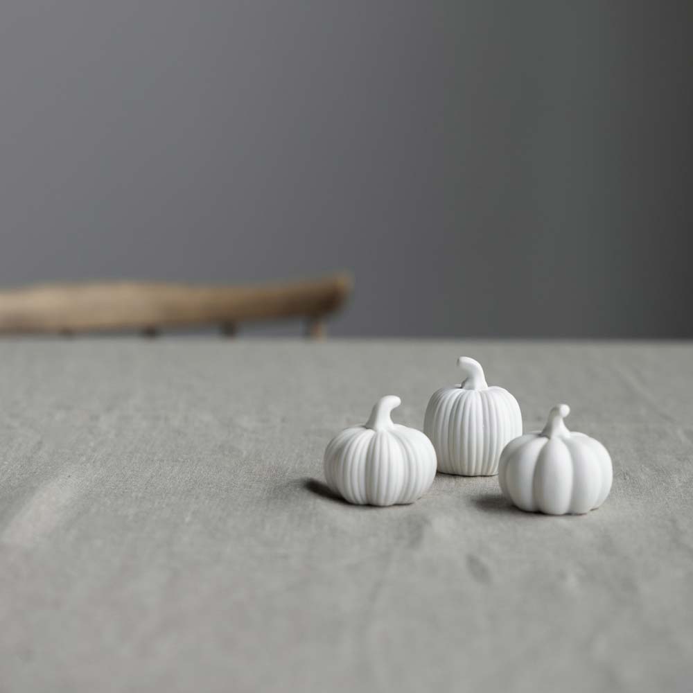 Three Majas Cottage - Kürbis Keramik weiße Kürbisse in verschiedenen Größen liegen auf einer Holzoberfläche. Der größte Kürbis hat blattförmige Ausschnitte.