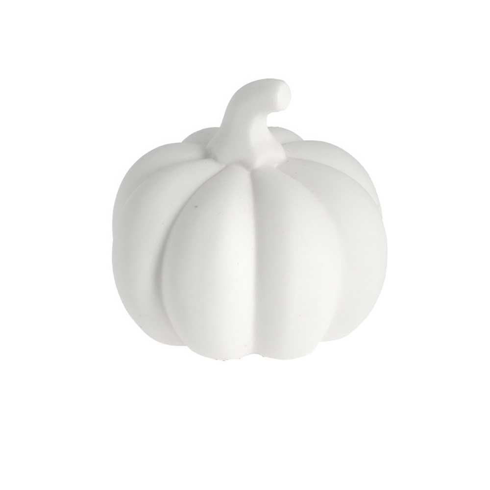 Der Clayre & Eef - Kürbis Stein Landhausstil Large Ø 23 cm ist ein kleiner weißer Keramikkürbis mit dekorativen floralen Schnitzereien und einem braunen Stiel, gestaltet als Teelichthalter mit zwei ausgestanzten ovalen Löchern.