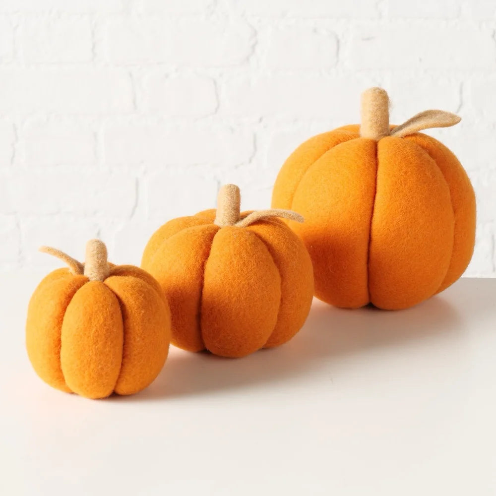 Jeder Kürbis ist mit viel Liebe handgefertigt und besticht durch seine weiche, filzähnliche Oberfläche. Die Kombination aus leuchtendem Orange und einem naturnahen Stiel mit Blattdetail sorgt für einen charmanten, natürlichen Look. Dank der drei unterschiedlichen Größen kannst du deine Deko vielseitig arrangieren – ob als Highlight oder als Teil eines größeren Ensembles.Dekotipp