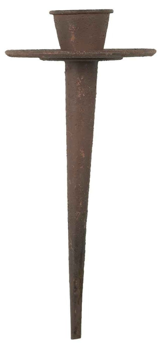 Der konisch zulaufende Spieß lässt sich leicht in Erde, Moos oder Steckmasse drücken. Der breite Teller fängt herabtropfendes Wachs auf und bietet der Kerze einen stabilen Halt. Dank der robusten Metallkonstruktion trotzt der Spieß Wind und Wetter. Seine rostige Oberfläche entwickelt mit der Zeit eine noch tiefere Patina und passt wunderbar zu naturverbundenen Dekoideen.