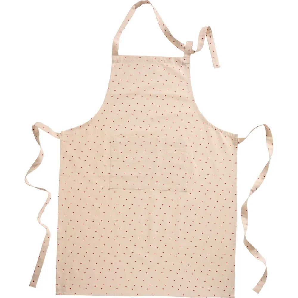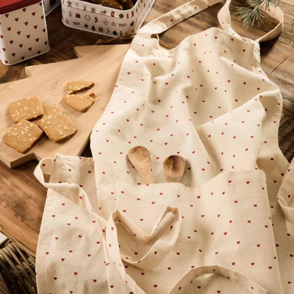 Mit dieser romantischen Schürze wird jedes Küchenabenteuer zum Vergnügen. Die dezenten roten Herzchen auf dem naturfarbenen Baumwollstoff verbreiten eine heimelige Stimmung – ideal für gemütliche Backnachmittage mit der Familie.