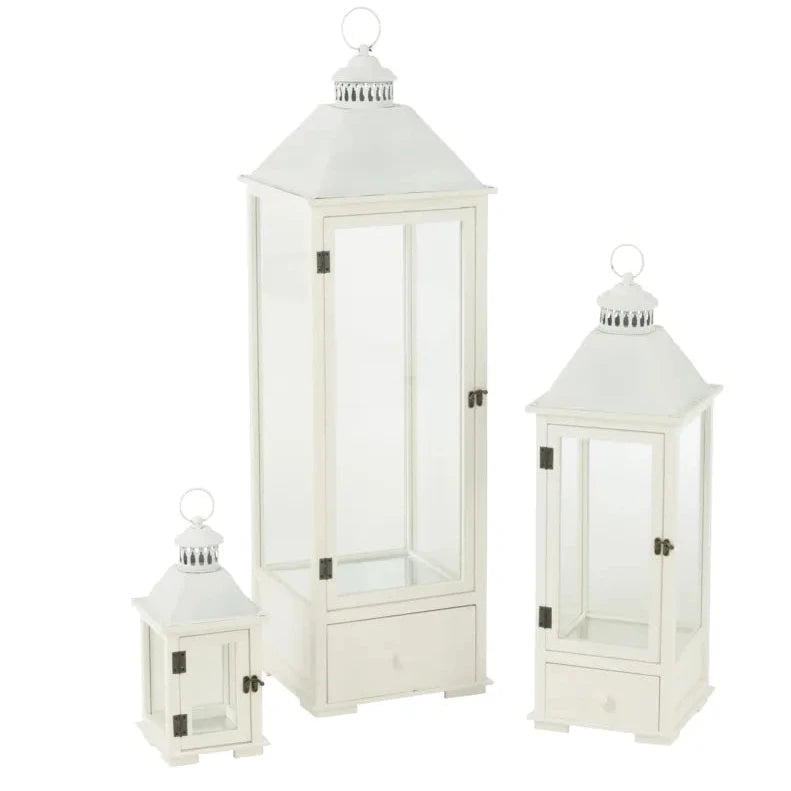 Dieses dreiteilige Laternen‑Set aus Tannenholz und Metall schafft stimmungsvolle Lichtinseln im skandinavischen Stil. Die weißen Turm‑Laternen variieren in der Höhe und wirken als Gruppe besonders harmonisch. Ihre klaren Linien, großen Glasflächen und die feinen Metallverstrebungen lassen Kerzenschein behaglich durchscheinen.