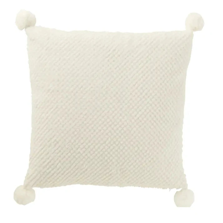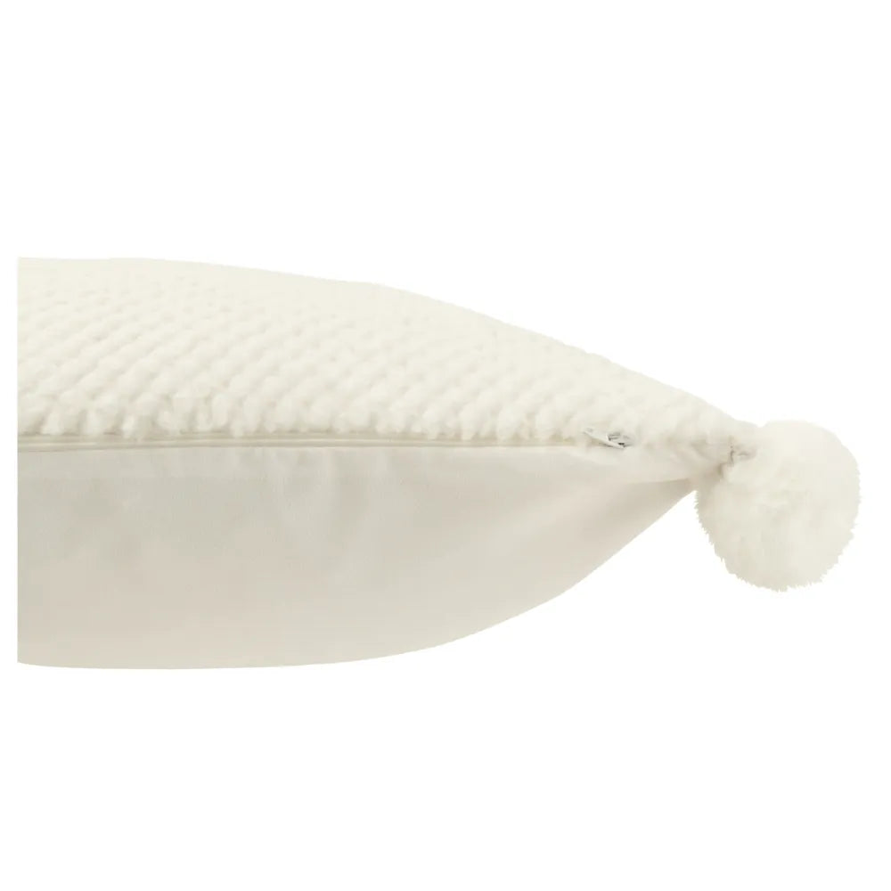 Dieses quadratische Kissen setzt mit seiner strukturierten Oberfläche und den dekorativen Pompons an den Ecken einen besonderen Akzent. Das neutrale Weiß fügt sich harmonisch in jedes Interieur ein und wirkt durch die sanfte Stoffmischung aus Baumwolle, Leinen und Polyester angenehm weich. Als dekoratives Stück auf Sofa, Sessel oder Bett schafft es eine wohnliche Atmosphäre.