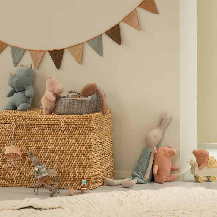 Setze das Nilpferd auf ein Regal neben Kinderbüchern oder platziere es auf dem Bett – sein skandinavischer Vintage-Look sorgt sofort für Gemütlichkeit und einen Hauch Nostalgie im Raum. Kombiniert mit Naturtönen oder pastelligen Farben entsteht eine harmonische Wohlfühlatmosphäre.
