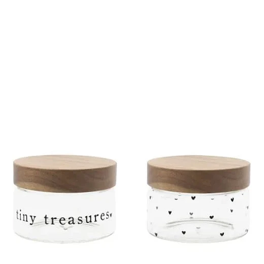 Dieses zauberhafte Aufbewahrungsglas bringt nordische Leichtigkeit direkt in dein Zuhause. Die Kombination aus klarem Glas, warmem Holzdeckel und den liebevollen Designs – ob mit zarten Herzchen oder dem charmanten Schriftzug "tiny treasures" – macht Ordnung halten zum reinsten Vergnügen ♥.