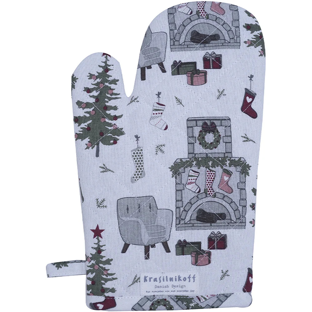 Ein knisterndes Kaminfeuer, ein bequemer Sessel und ein reich geschmückter Baum – dieser Ofenhandschuh erzählt eine Wintergeschichte und schützt deine Hände zuverlässig.