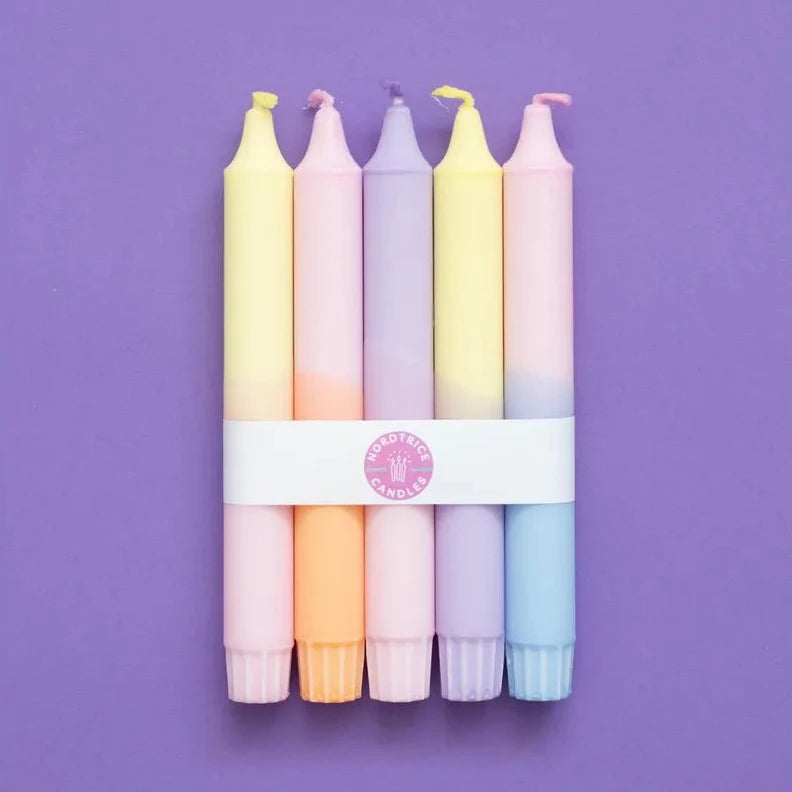 Bring sofort gute Laune in dein Zuhause mit diesem kunterbunten Kerzen-Set! Der verspielte "Pastell Party Mix" von Nordtrice verzaubert mit seinem einzigartigen Dip-Dye-Look und sorgt für nordische Leichtigkeit auf jedem gedeckten Tisch. Ob zum Geburtstagsfrühstück oder einfach für mehr Hygge im Alltag – diese handgemachten Lieblinge sind echte Stimmungsaufheller ♥.