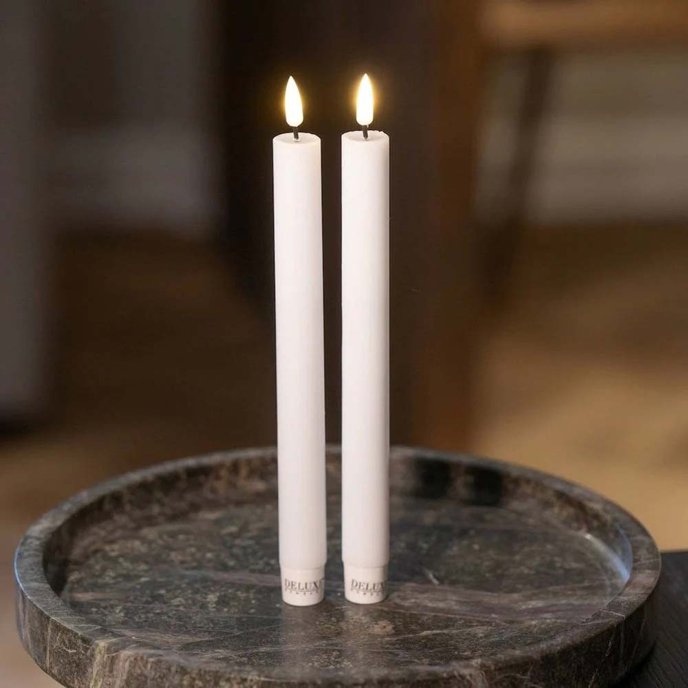 Die LED-Stabkerzen von Deluxe Homeart punkten mit edlem Design, sicherer Technik und absolut realistischer Flammenoptik. Mit dem zeitlosen Weißton fügen sie sich mühelos in klassische, moderne oder skandinavische Wohnstile ein. Die smarte Timerfunktion (per Fernbedienung steuerbar) sorgt für Komfort und Energieersparnis. Ideal auch als Geschenk – stimmungsvoll, sicher und stilvoll.