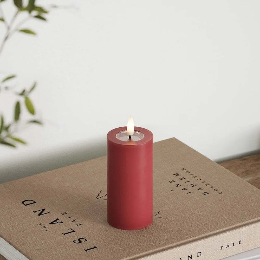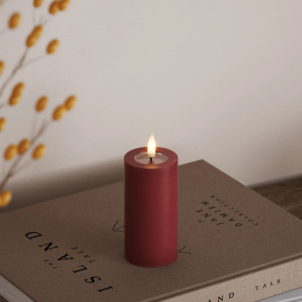 Diese schlanke LED‑Blockkerze in sattem Bordeaux bringt skandinavische Gemütlichkeit in dein Zuhause. Der Echtwachsmantel fühlt sich wie eine klassische Kerze an, während die sanft flackernde LED‑Flamme auf einem kleinen Metallschälchen authentisches Licht spendet. Perfekt für stimmungsvolle Abende auf dem Sideboard, dem Fensterbrett oder als Akzent auf dem Festtagstisch.