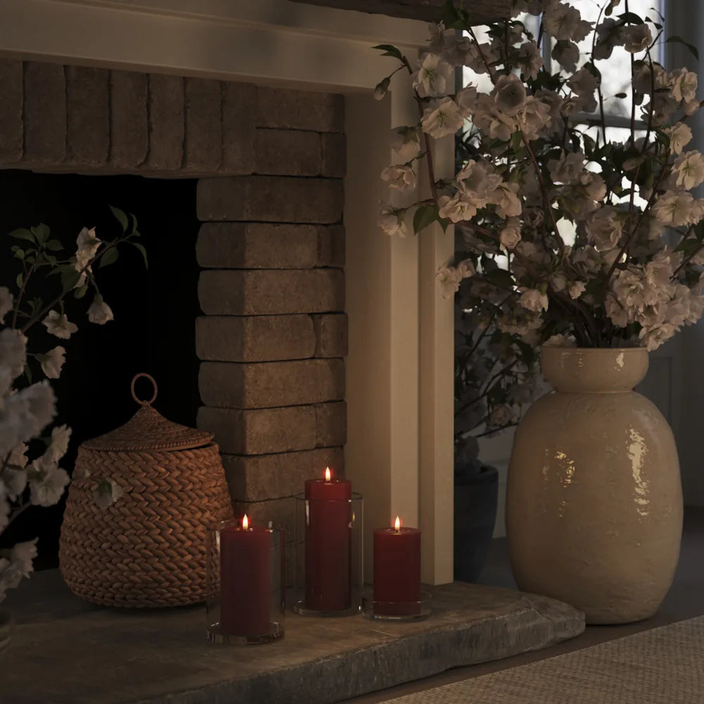Kombiniere diese Bordeaux‑Kerze mit Naturmaterialien wie Holz und getrockneten Zweigen für einen warmen Herbst‑Look. In Gruppen mit Blockkerzen in verschiedenen Höhen arrangiert entsteht ein elegantes Centerpiece auf dem Wohnzimmertisch.