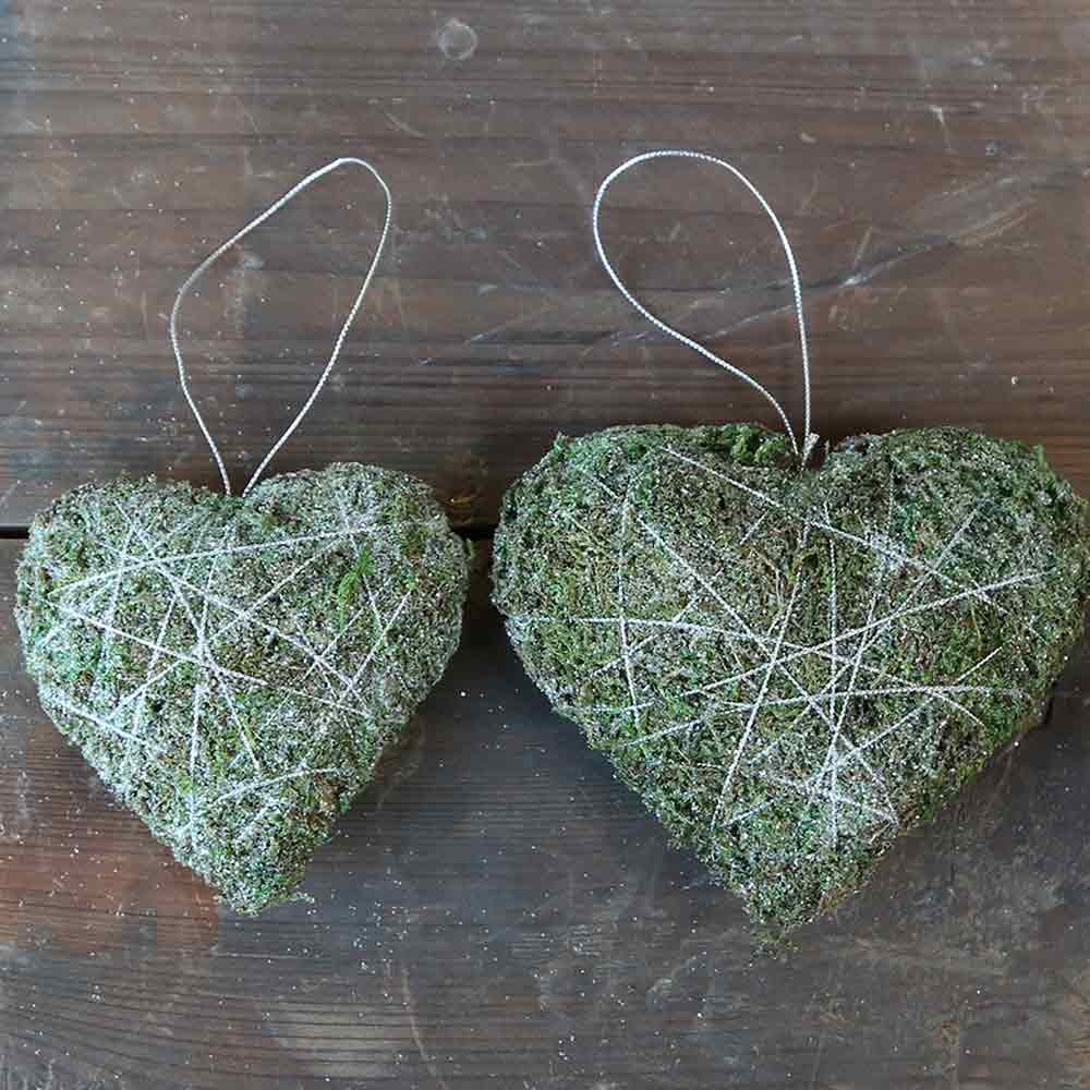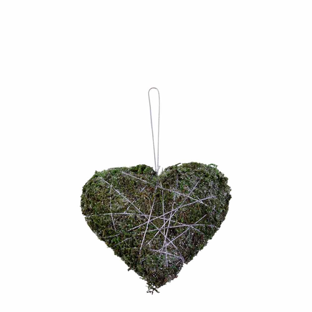 Das Herz wird aus echtem, getrocknetem Moos geformt und mit einem zarten Faden in einem sternförmigen Muster umwickelt. Dieses Garn hält das Moos zusammen und bildet zugleich einen dezenten Blickfang. Dank des integrierten Drahtbügels lässt sich das Herz ganz leicht aufhängen. Mit einer Größe von ca. 10 cm Höhe, 10 cm Länge und 3 cm Breite ist das Moosherz kompakt, aber dennoch wirkungsvoll.