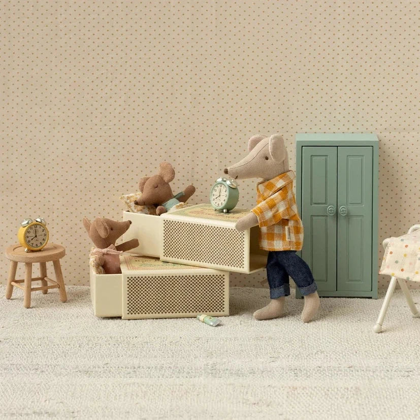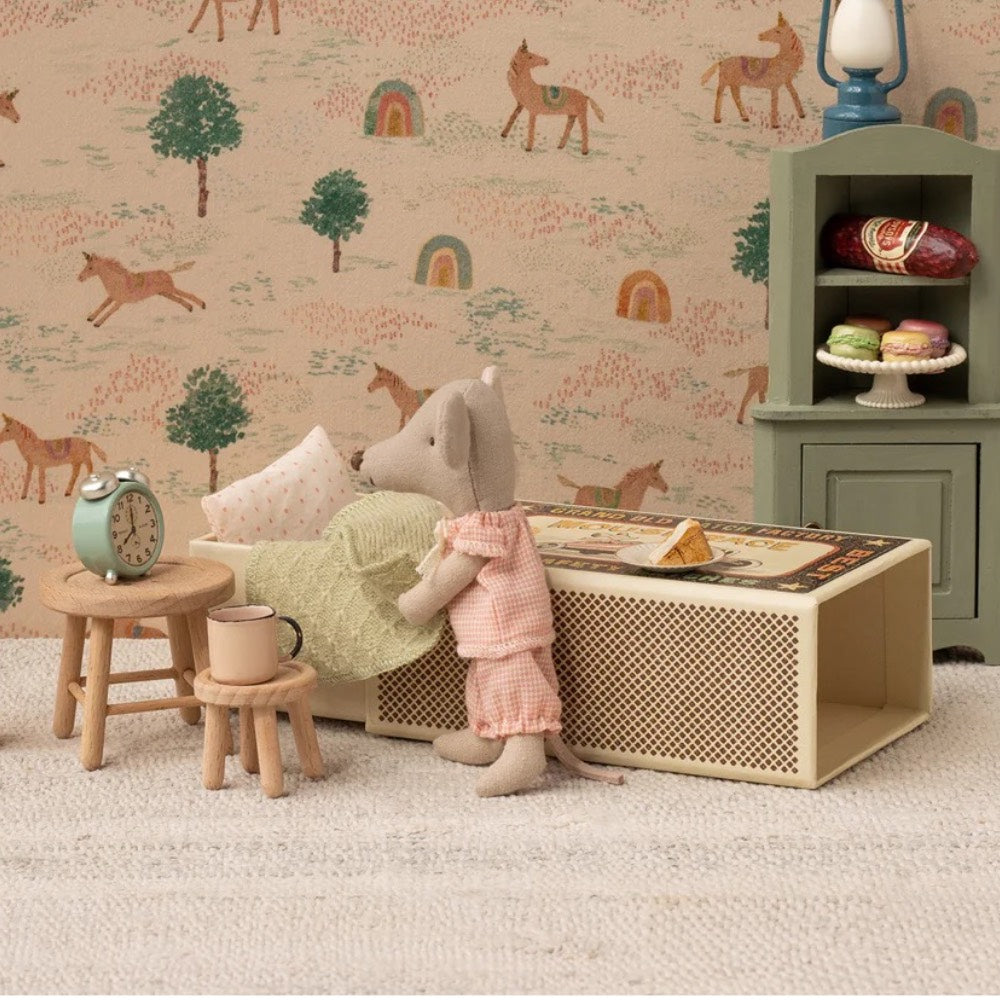 Neben den Grundmöbeln bietet das Sortiment an Zubehör eine Vielzahl an Möglichkeiten, um die Welt von Maileg noch lebendiger zu gestalten. Kleine Teppiche, Luftmatratzen und selbst Miniatur-Lampen sorgen für Detailreichtum. Besonders entzückend sind die Streichholzschachteln, die als Betten dienen und damit die Fantasie anregen.