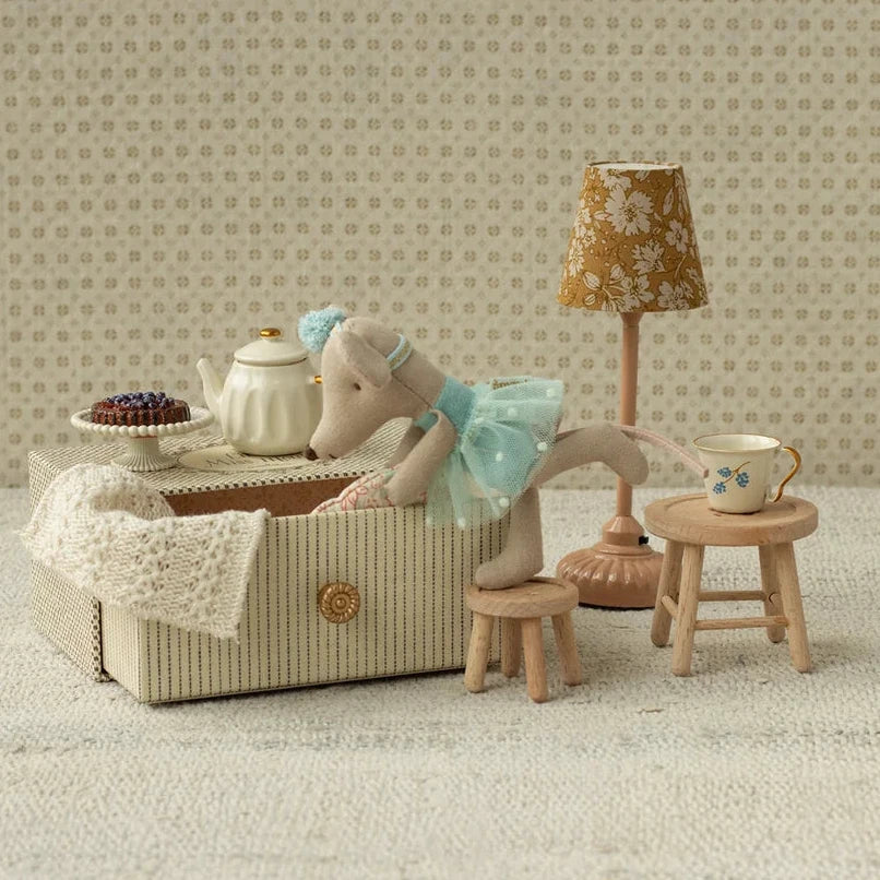 Die kleine Tanzmaus verzaubert mit ihrem hellblauen Tutu und dem passenden Haarband. Wenn sie nach dem Ballett müde wird, kuschelt sie sich in ihre charmante Schachtel, die wie ein Daybed gestaltet ist. Diese Schachtel ist liebevoll bedruckt und erinnert an alte Streichholzschachteln. Ein gemütliches Bettchen mit Matratze, Kissen und Decke sorgt für Geborgenheit – fast wie bei Oma.