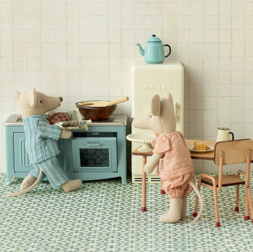 Stelle diese entzückende Küche ins Zentrum des Maileg Maus-Hauses! Ergänze sie mit winzigen Geschirrteilen und einer kleinen Tischgruppe, um ein gemütliches Esszimmer zu schaffen, wo die Mäusefamilie zum Kaffee und Kuchen zusammenkommt. So wird jede Mahlzeit zu einem Fest! ♥