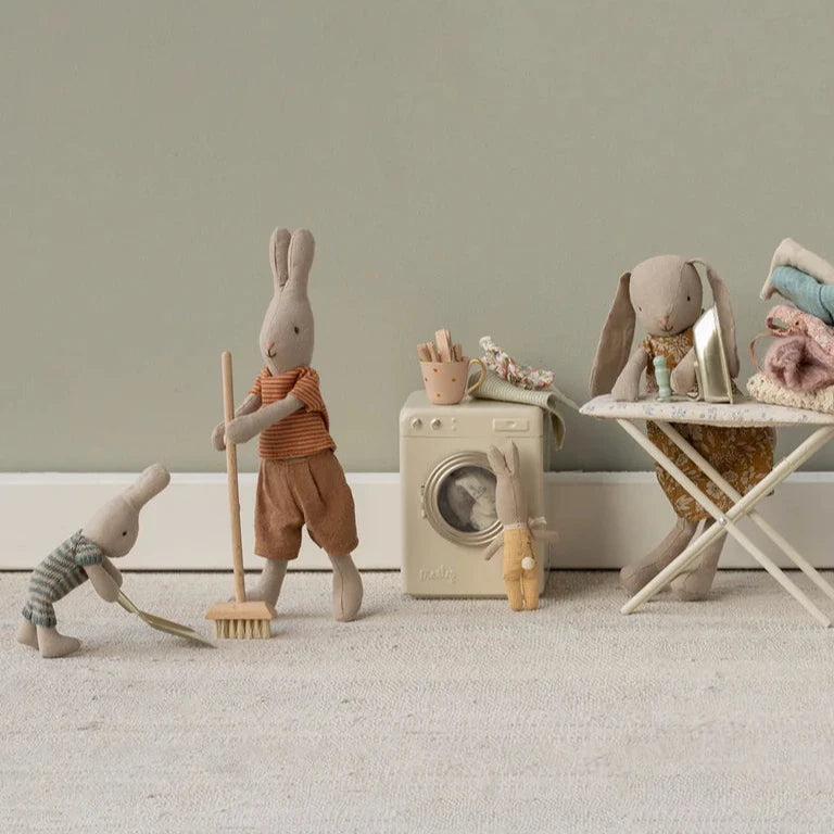 Dieses Besen-Set bringt Ordnung ins Puppenhaus. Der kleine Holzbesen mit echten Naturborsten und das passende Metall-Kehrblech sehen aus wie antike Reinigungsgeräte – ideal für fleißige Maileg-Mäuse. Kinder können spielerisch Haushaltsrituale nachahmen und dabei ihre Motorik trainieren. Ein liebevolles Accessoire für detailreiche Spielwelten.