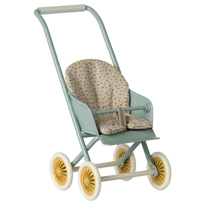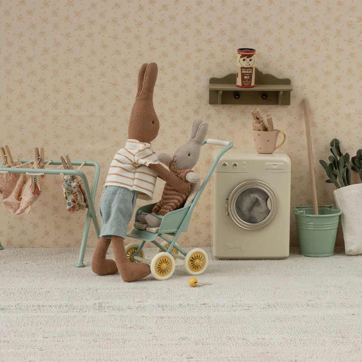 Dieser süße Puppenhaus-Kinderwagen in zartem Rosa oder Mint ist perfekt für Maileg-Häschen und -Kaninchen der Größe "Micro". Ein treuer Begleiter für fantasievolle Abenteuer, der jede Spielzeit bereichert.