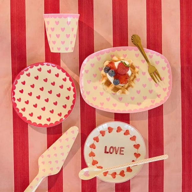 Kreiere eine romantische Kaffeetafel, indem du den kleinen Kuchenteller mit anderen Artikeln aus der Hearts‑Kollektion von RICE kombinierst. Auf dem Lifestyle‑Bild zeigt sich, wie hübsch der Teller zu Tassen, Platten und Besteck im gleichen Druck harmoniert. Ein rotes oder rosa gestreiftes Tischset setzt die liebevollen Herzchen besonders in Szene.