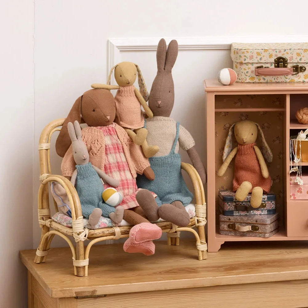 Dieser bezaubernde Hase in Größe 3 von Maileg bringt sofort die typische skandinavische Gemütlichkeit in dein Zuhause. Mit seinem weichen Leinenstoff und dem liebevoll gestrickten Outfit in warmen Brauntönen und Teal ist er ein wahrer Freund fürs Leben ♥. Ob als treuer Spielgefährte oder als nostalgischer Blickfang im Kinderzimmer – dieses Prachtexemplar sorgt ruckzuck für eine Portion nordische Leichtigkeit.