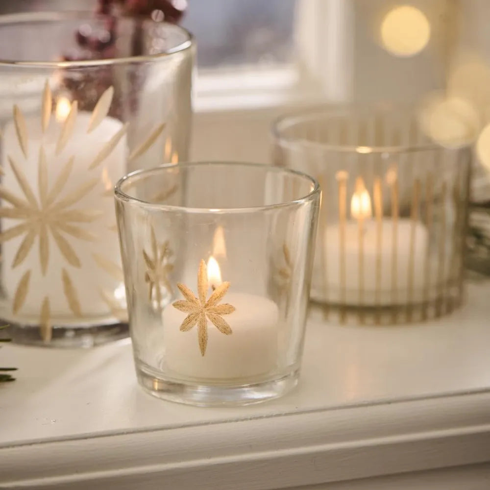 Das zierliche Teelichtglas begeistert mit seinem klaren Glas und den eingravierten Sternmotiven. Wenn ein Teelicht darin brennt, werfen die Sterne einen zauberhaften Schein und schaffen sofort Wohlfühlathmosphäre.