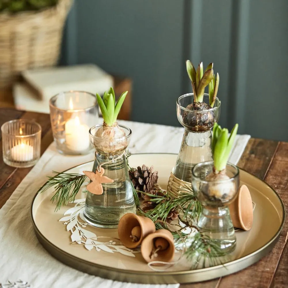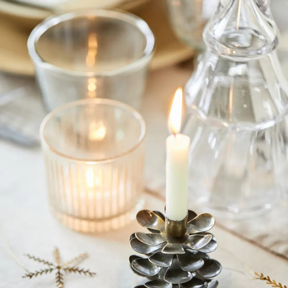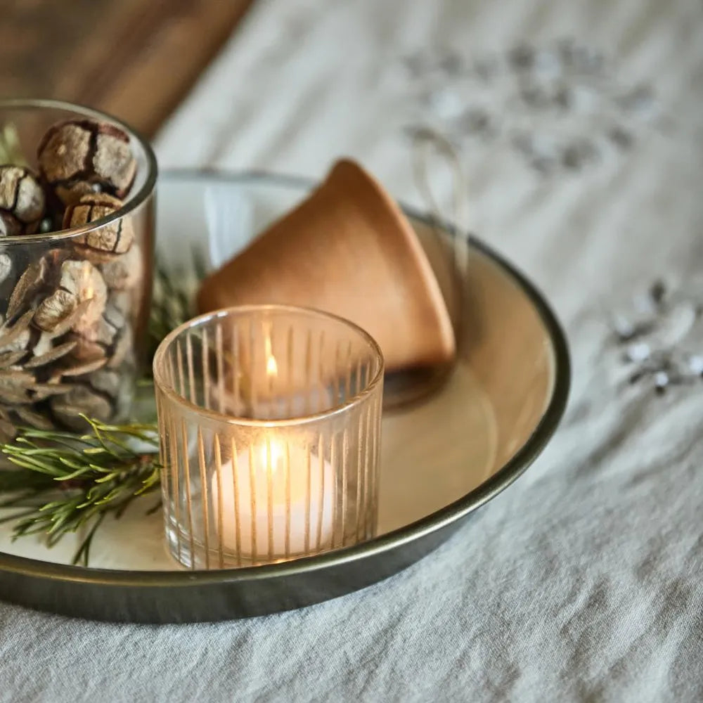 Mix & Match! Kombiniere dieses Glas mit anderen Teelichthaltern unterschiedlicher Formen und Muster. Auf einem Holzbrett arrangiert entsteht ein spannendes Spiel aus Licht und Struktur.