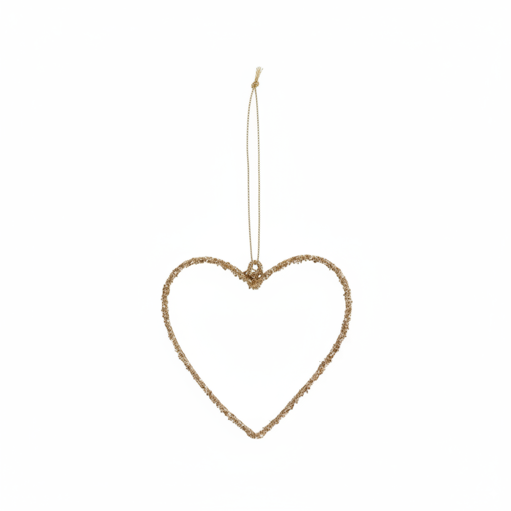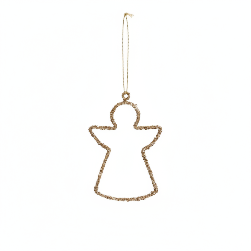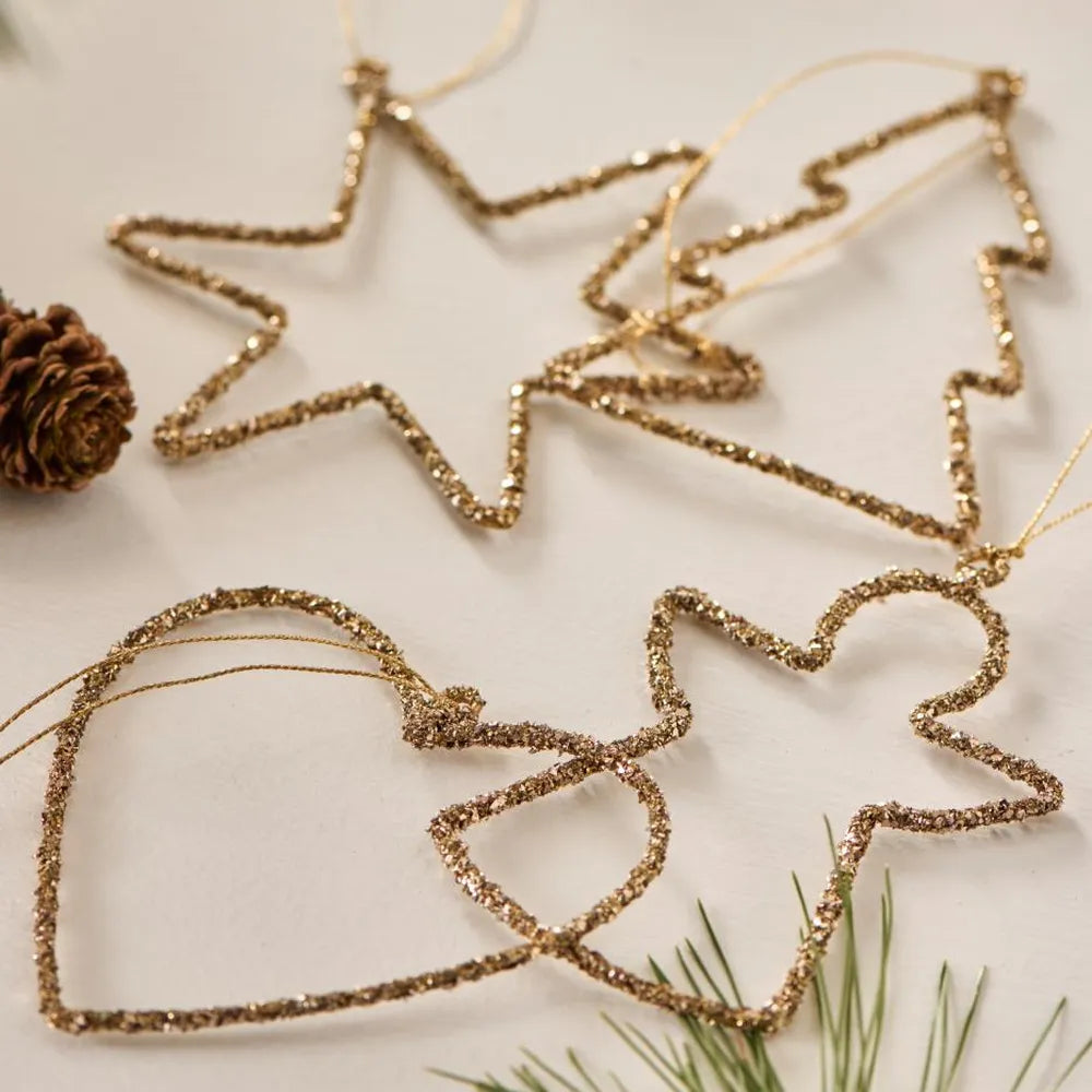 Dieses Set aus vier filigranen Anhängern verleiht deinem Weihnachtsbaum oder Fenster einen edlen Glanz. Die offenen Drahtformen – Tannenbaum, Stern, Herz und Engel – sind mit goldenem Glitter verziert und wirken dennoch leicht und dezent.