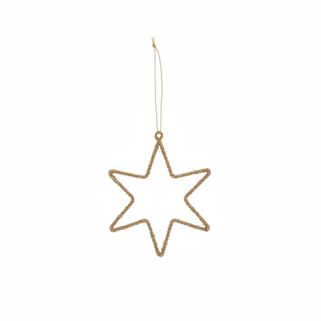 Die Ornamente bestehen aus feinem Metalldraht, der mit glitzernden Partikeln umwickelt ist. Jede Figur ist unterschiedlich geformt, aber stilistisch aufeinander abgestimmt. Dank der goldfarbenen Schlaufen lassen sich die Anhänger einfach aufhängen. Das Set ist vielseitig einsetzbar – am Weihnachtsbaum, an Zweigen in der Vase oder als Geschenkanhänger.