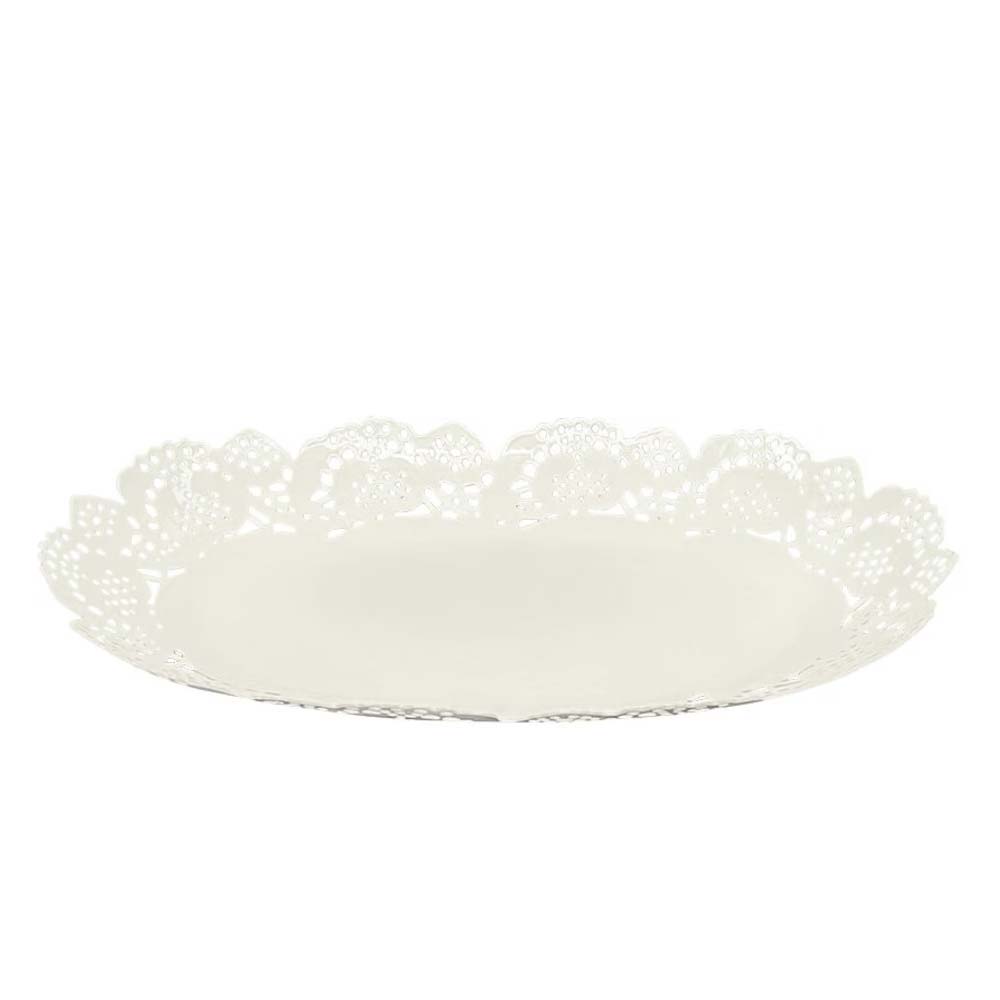 Der filigrane Spitzenrand erinnert an Omas feine Tischdecken und sorgt für einen Hauch von Vintage-Romantik. Gefertigt aus lackiertem Eisen, überzeugt das Tablett durch eine glatte, glänzende Oberfläche und seine robuste Qualität – ideal zum stilvollen Servieren oder Dekorieren.