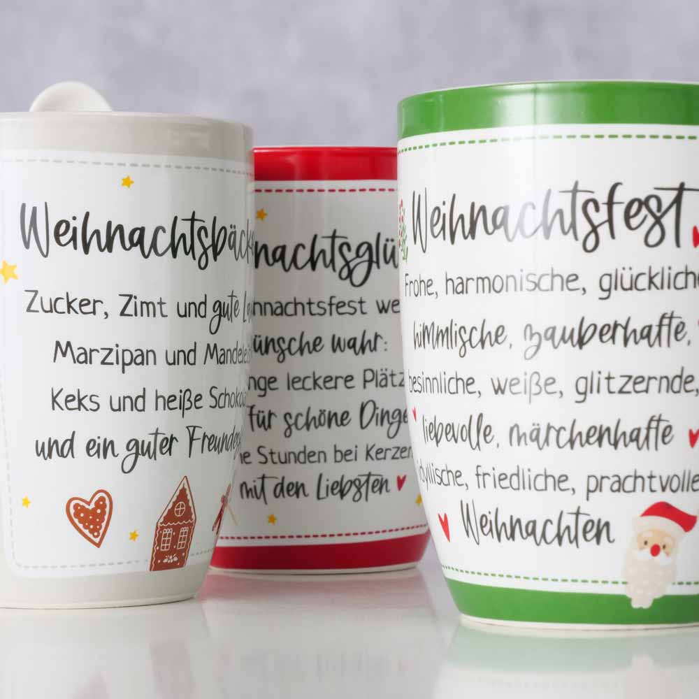 - Detailreiches Design: Die Tasse zeichnet sich durch ein fein gearbeitetes Design aus, das durch einen inspirierenden Weihnachtsspruch ergänzt wird. Dieser Spruch ist nicht nur eine Dekoration, sondern eine Botschaft, die die Essenz der Weihnachtszeit einfängt.